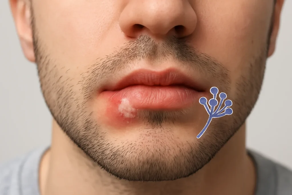 Primero, es importante saber que los hongos en los labios son una infección. Esta infección es causada por un hongo llamado Candida albicans. De hecho, este hongo ya vive en nuestra boca, piel y sistema digestivo de forma natural. Normalmente, no causa ningún problema. Nuestro sistema inmunitario lo mantiene bajo control. Sin embargo, el problema empieza cuando este hongo crece demasiado. Este crecimiento excesivo provoca los síntomas que conocemos como candidiasis oral o “muguet”. En resumen, no se trata de una enfermedad grave en personas sanas, sino de un desequilibrio en nuestro cuerpo.